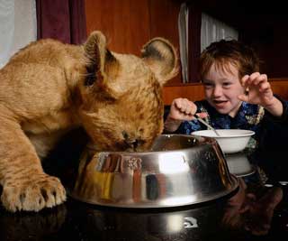 近日,英国《每日邮报》刊登了一组十分温馨感人的照片,照片中有一名小男孩与一只幼狮一起吃早餐、一起玩耍,看上去就像是家人一般。报道称,照片中的这个小男孩年仅3岁,其是澳大利亚最大的动物马戏团--星尘马戏团的一名新驯兽师。