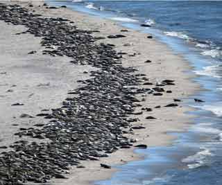 近日,美国马萨诸塞州科德角小镇查塔姆,灰海豹散布在莫诺莫伊国家野生动物保护区的海滩上晒太阳。该地是美国新英格兰地区最受哺乳动物欢迎的栖居场所之一,大约1.5万多只海豹游出海面,到阳光下嬉戏。