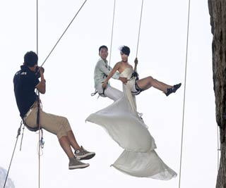 10月26日,广西壮族自治区柳州市,方静和先生赵先生一起拍摄婚纱照。方静和老赵都是户外运动爱好者,他们选择了来到柳江县六岩村一处攀岩地点拍摄婚纱照,爬到离地面20米高的悬崖上,挂在半空3个多小时,他们拍摄了一组“勇敢者”的婚纱照片。(新华网)