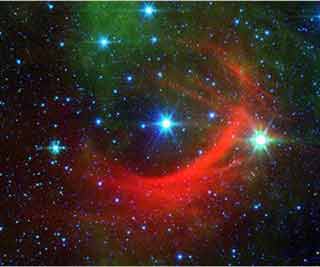 美国国家航空航天局(NASA)最新发布的图像显示,恒星的高速碰撞使银河系产生激荡,形成弧光。这次的这颗速逃星名为高速星王良二,其运行路径上的一道道红色发光物质被称为弓形激波,经常见于银河系中速度最快、质量最大的恒星前方。令人难以置信的是,这个在高速星王良二前方形成的激波距其大约4光年,显示出该恒星对其周围环境的影响是何其之大。(中新网)