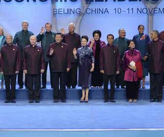 2014年11月10日,习近平和彭丽媛在水立方为2014年APEC嘉宾举行欢迎晚宴以及文艺演出。习近平携夫人彭丽媛欢迎各国领导人。APEC领导人所穿服装是一系列展示中国人新形象的中式服装,其根为中,魂为礼,形为新,谓之“新中装”。(中新网)