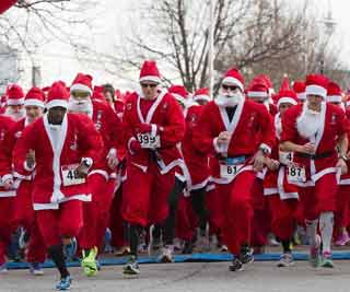 11月30日,在加拿大安大略省汉密尔顿市,身着“圣诞老人”服装的参赛者在比赛中。当日,汉密尔顿市举办一年一度的“圣诞老人”五公里跑比赛,吸引近千名“圣诞老人”积极参与。(新华网)