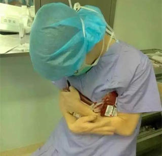 近日,一名在手术室内捂着冰凉血袋的医生感动了不少网友。2月27日凌晨,为了尽快给手术台上的患者输血,郑州大学第一附属医院急诊科医生张润将两袋只有4度的血细胞抱在怀里,嘴里还念叨着“求求你,快点升温,快点升温,救命呢”。图为张润捂住血袋。(央广网)