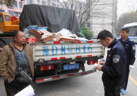 图为执法人员正在对占道货车进行登记(邱洪 摄)