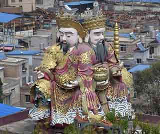沿着昆明市筇王路环山而上,一房顶上伫立着一尊巨大的多面金刚像,四面四尊金刚背靠背坐在一起,每一面的金刚都造型不同,细节丰富。(中新网)