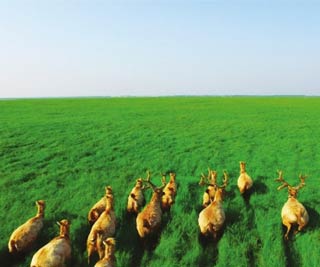 图:麋鹿群在东洞庭湖保护区内奔跑