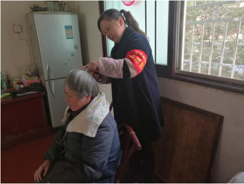 图为社区工作人员为老人梳剪头发。(许 瑰 摄)