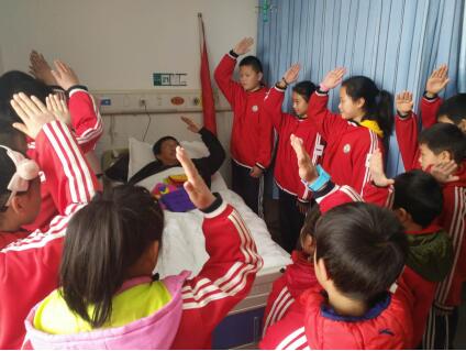 图为少先队员向见义勇为教师余以海致敬(梅磊 摄)
