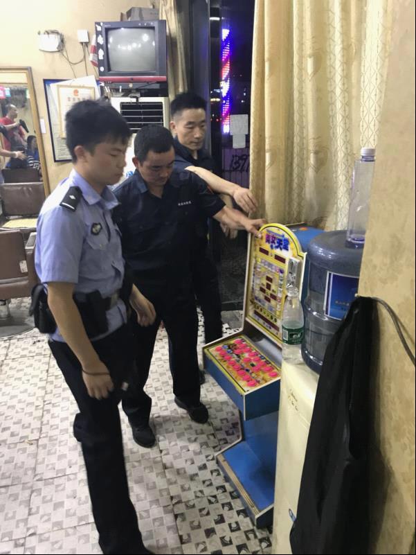 图为城陵矶街道综治巡逻队夜间巡逻查获收缴赌博机现场(古恋 摄)
