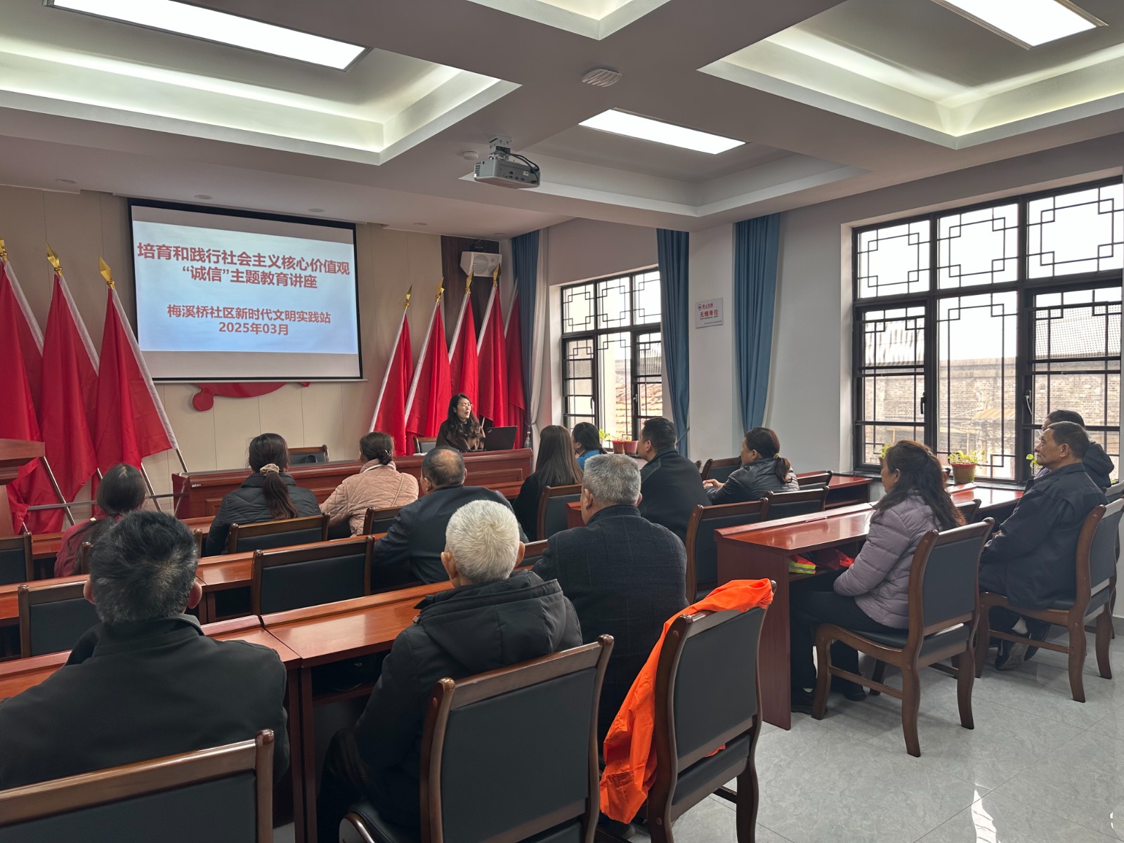 为培育和践行社会主义核心价值观,增强居民对诚信价值的认识,倡导诚实守信的社会风尚。3月10日下午,梅溪桥社区新时代文明实践站在梅溪桥社区二楼会议室组织开展了2025年培育和践行社会主义核心价值观——“诚信”主题教育讲座。